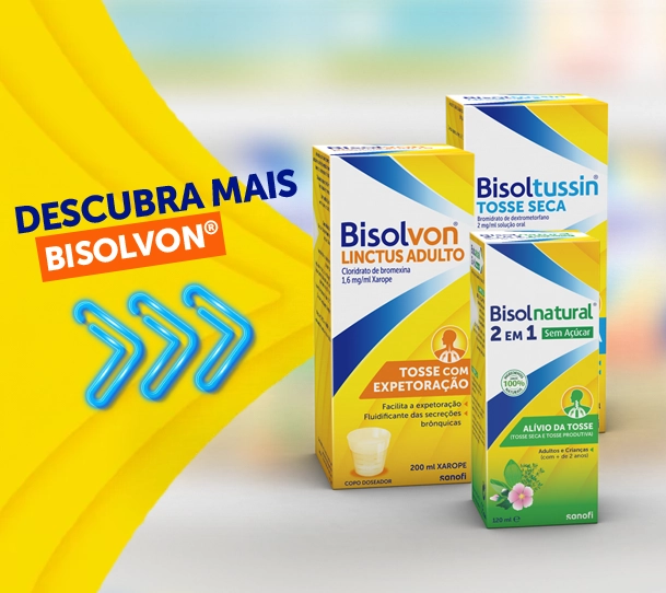 Bisolvon® (cloridrato de bromexina), adjuvante mucolítico do tratamento antibacteriano das infecções respiratórias em presença de hipersecreção brônquica. Precauções/contraindicações: gravidez, aleitamento, hipersensibilidade à composição, úlcera gastroduodenal, doença hepática e insuficiência renal, asma, lesões cutâneas, intolerância à frutose (xarope), intolerância à galactose (comprimidos). Não associar com um antitússico nem com um secante de secreções. Pode haver um aumento no fluxo das secreções. Os comprimidos contêm lactose. O xarope está isento de açúcar, sendo por isso adequado para diabéticos. O xarope Criança só deve ser administrado a crianças com menos de 2 anos de idade com supervisão médica. Leia atentamente o folheto informativo. Em caso de dúvida ou persistência dos sintomas consulte o seu médico ou farmacêutico. (3.0)