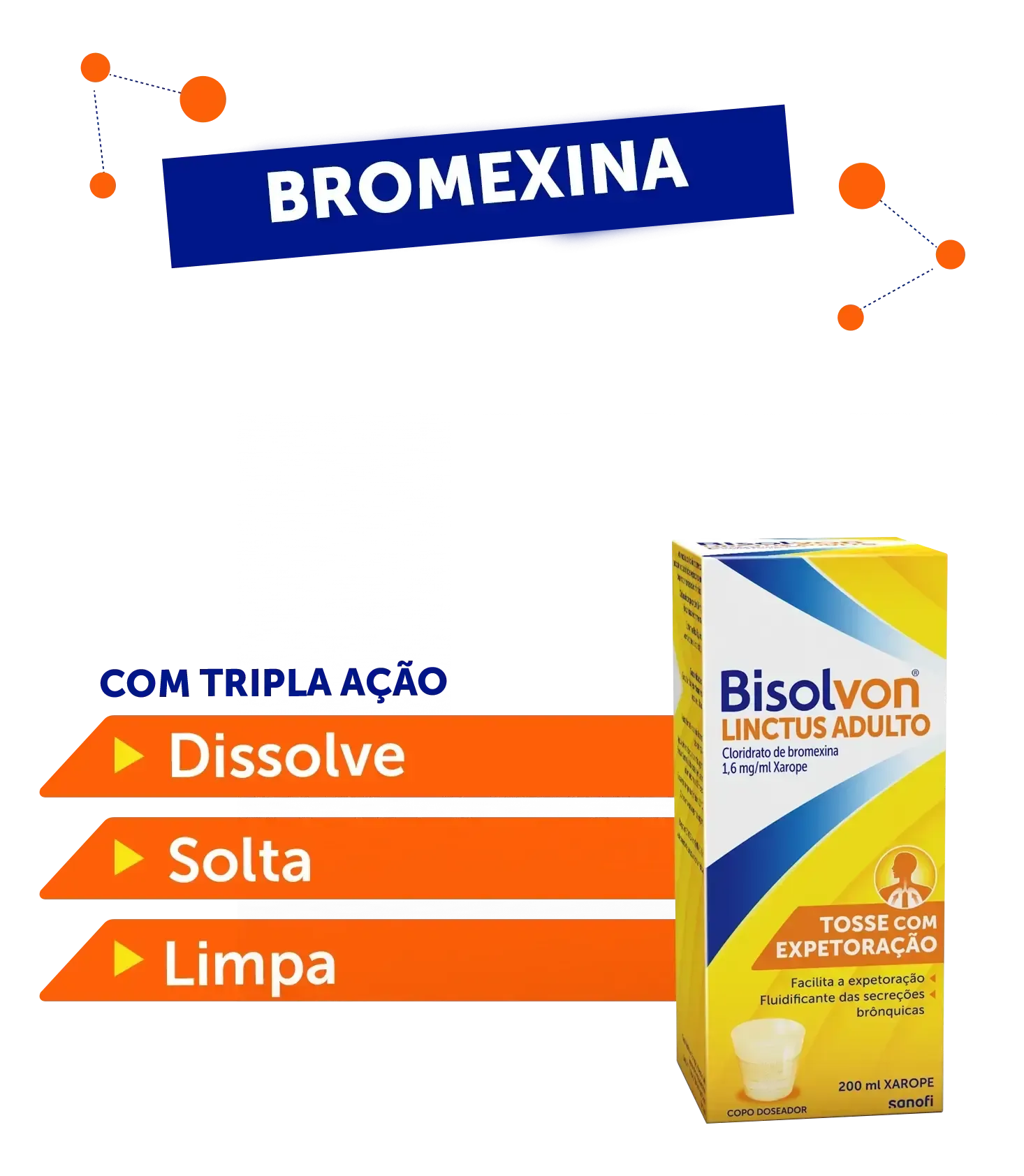 As moléculas de bromexina e ambroxol são rapidamente absorvidas e têm uma ação direta e específica sobre os pulmões. Ao mesmo tempo, o dextrometorfano atua no centro da tosse no cérebro, suprimindo de forma eficaz a necessidade de tossir, para um alívio rápido e duradouro.