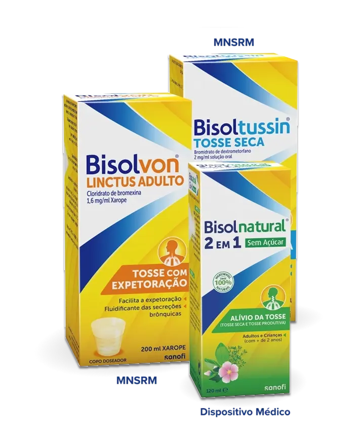 - Bisolnatural® 2 em 1 e Bisolnatural® 2 em 1 Sem Açúcar para o alívio da tosse seca ou produtiva e para acalmar a garganta