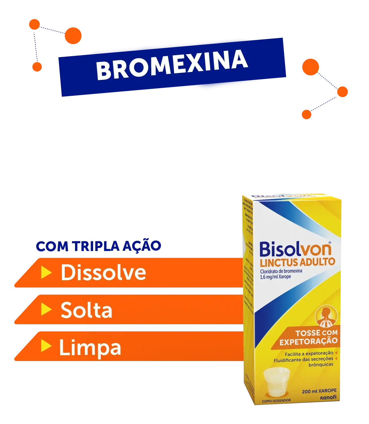 Bisolvon® (cloridrato de bromexina), adjuvante mucolítico do tratamento antibacteriano das infecções respiratórias em presença de hipersecreção brônquica. Precauções/contraindicações: gravidez, aleitamento, hipersensibilidade à composição, úlcera gastroduodenal, doença hepática e insuficiência renal, asma, lesões cutâneas, intolerância à frutose (xarope), intolerância à galactose (comprimidos). Não associar com um antitússico nem com um secante de secreções. Pode haver um aumento no fluxo das secreções. Os comprimidos contêm lactose. O xarope está isento de açúcar, sendo por isso adequado para diabéticos. O xarope Criança só deve ser administrado a crianças com menos de 2 anos de idade com supervisão médica. Leia atentamente o folheto informativo. Em caso de dúvida ou persistência dos sintomas consulte o seu médico ou farmacêutico. (3.0)
